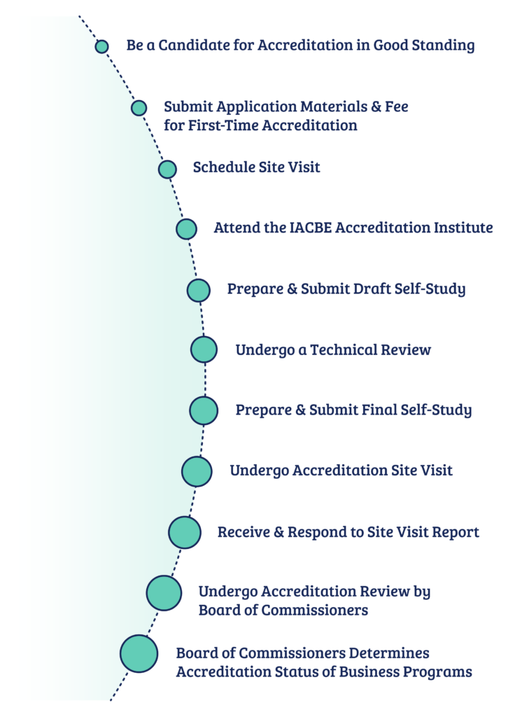 For the business programs of an academic business unit to be considered for first-time accreditation by the IACBE, the academic business unit must follow the process summarized below:
